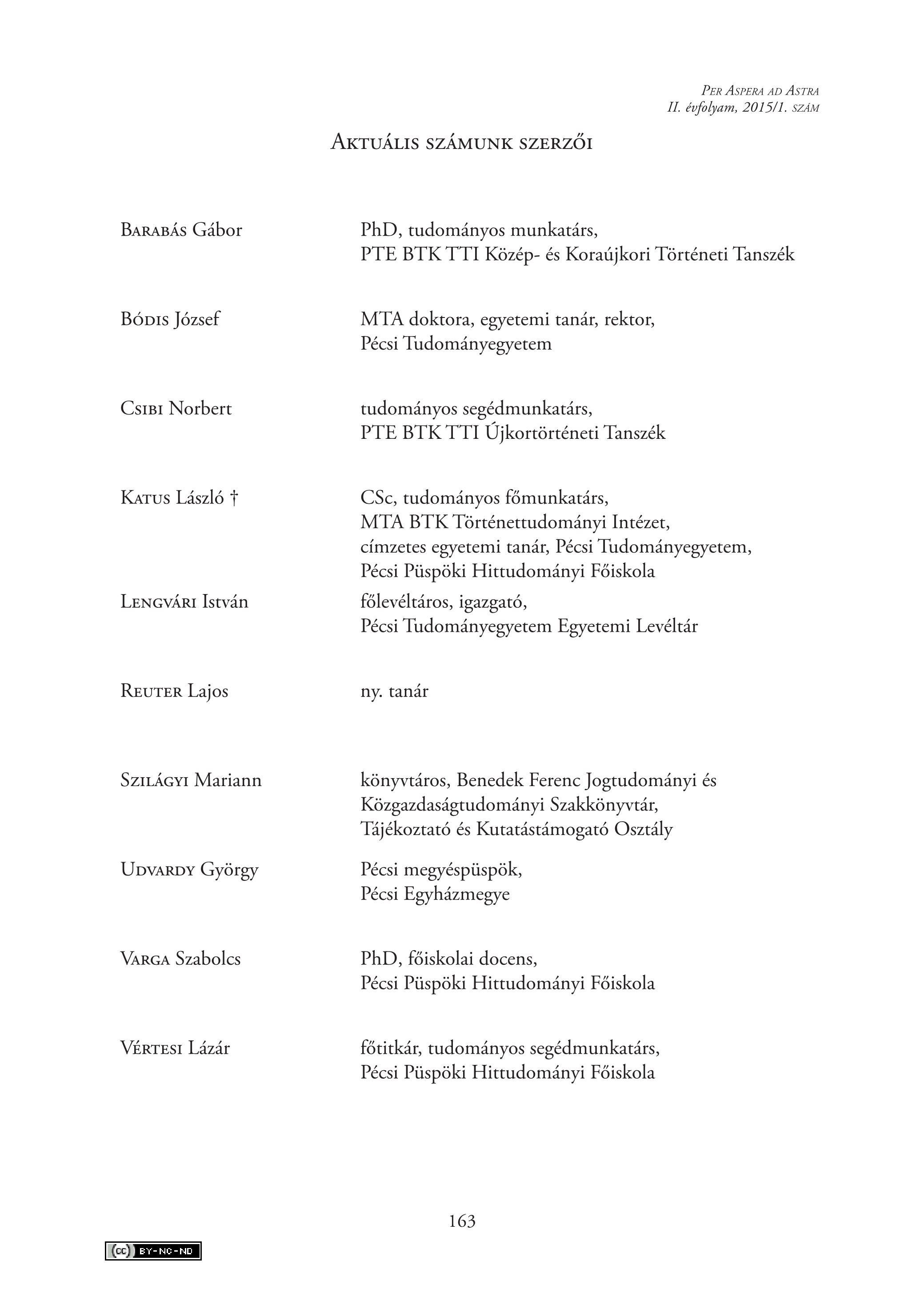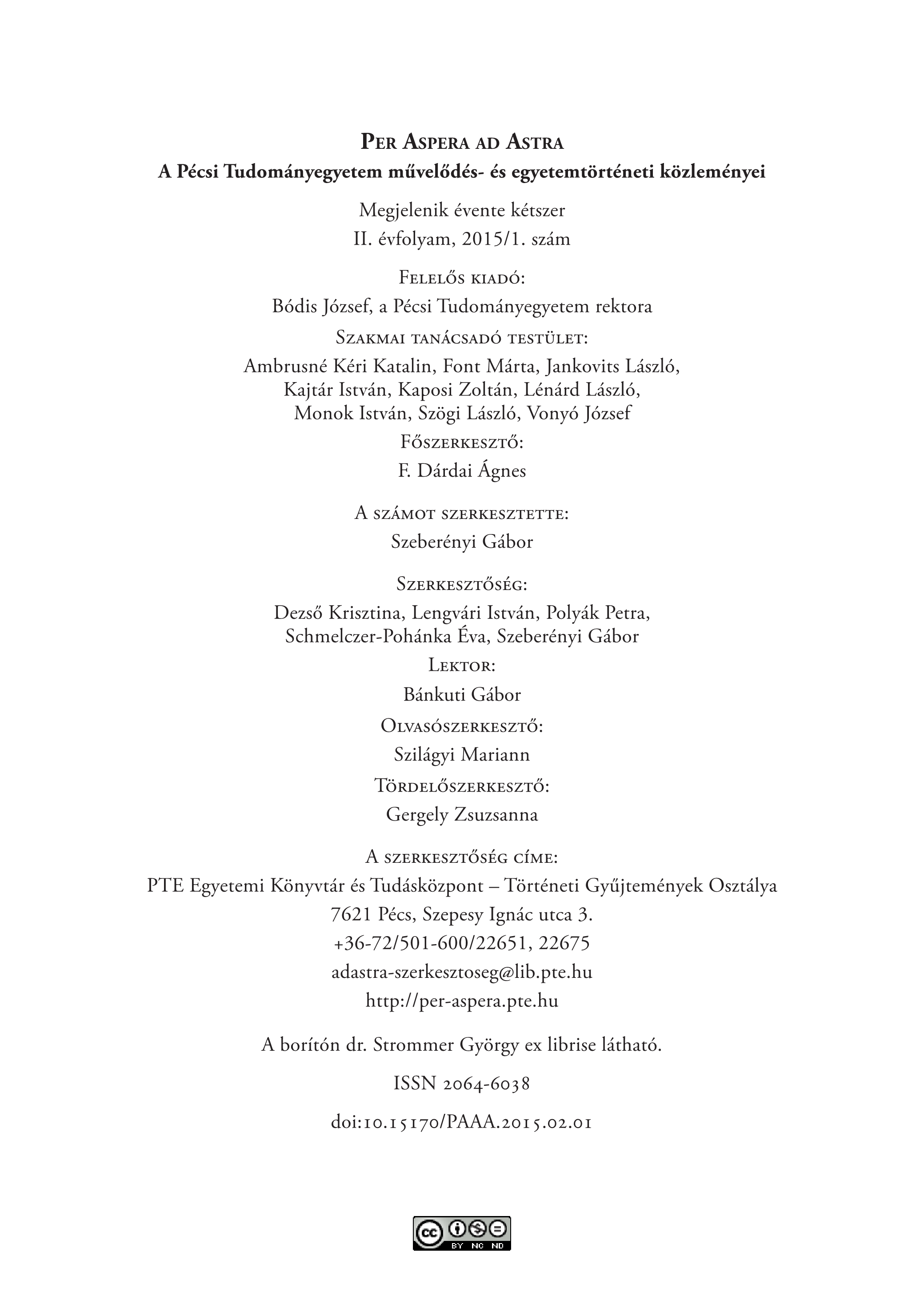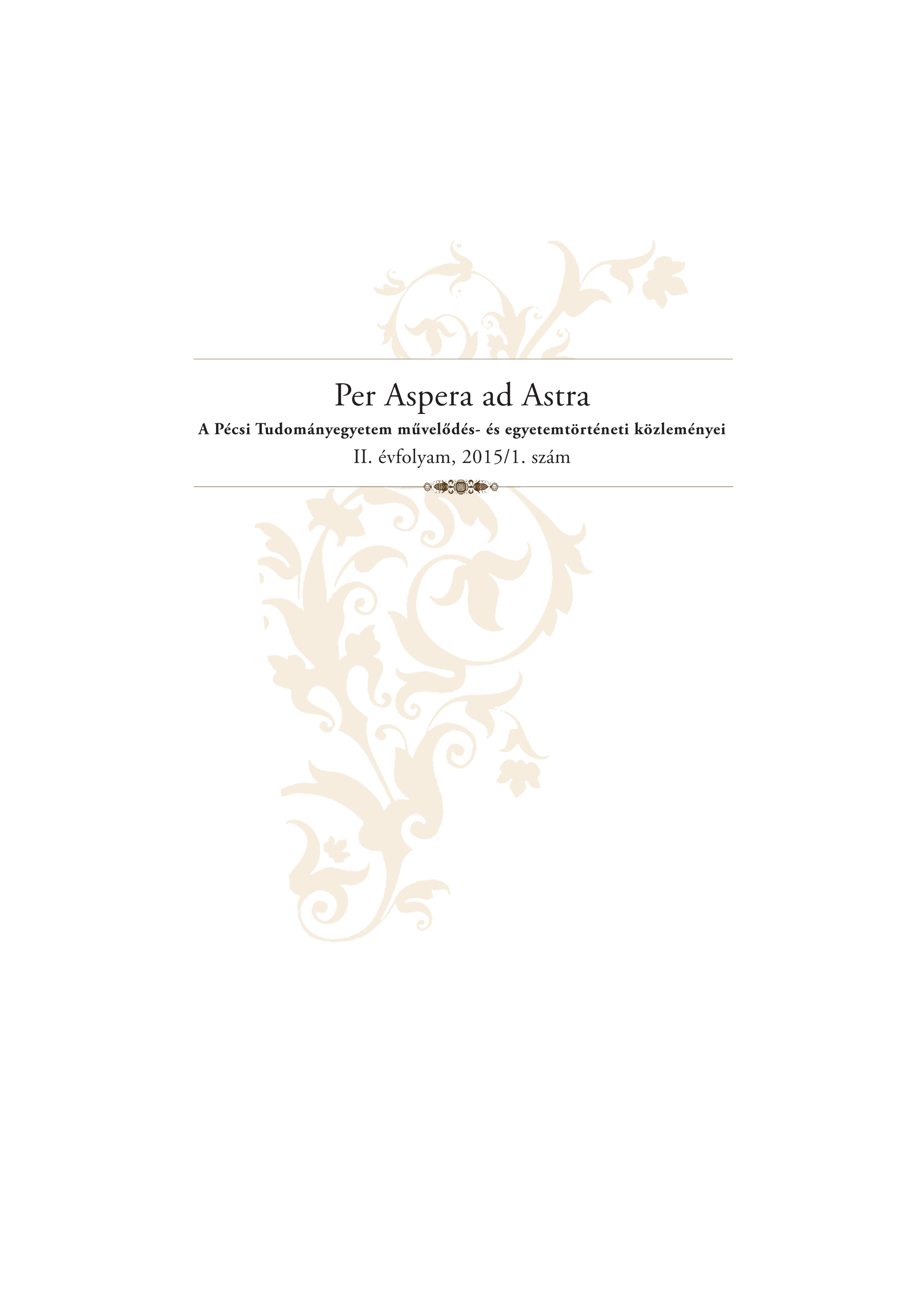 2015. július havában megjelent a Per Aspera ad Astra, a Pécsi Tudományegyetem művelődés- és egyetemtörténeti közleményei 2015/1. online száma. Az „Egyház és művelődés” témáját járják körül az aktuális számban megjelent írások.