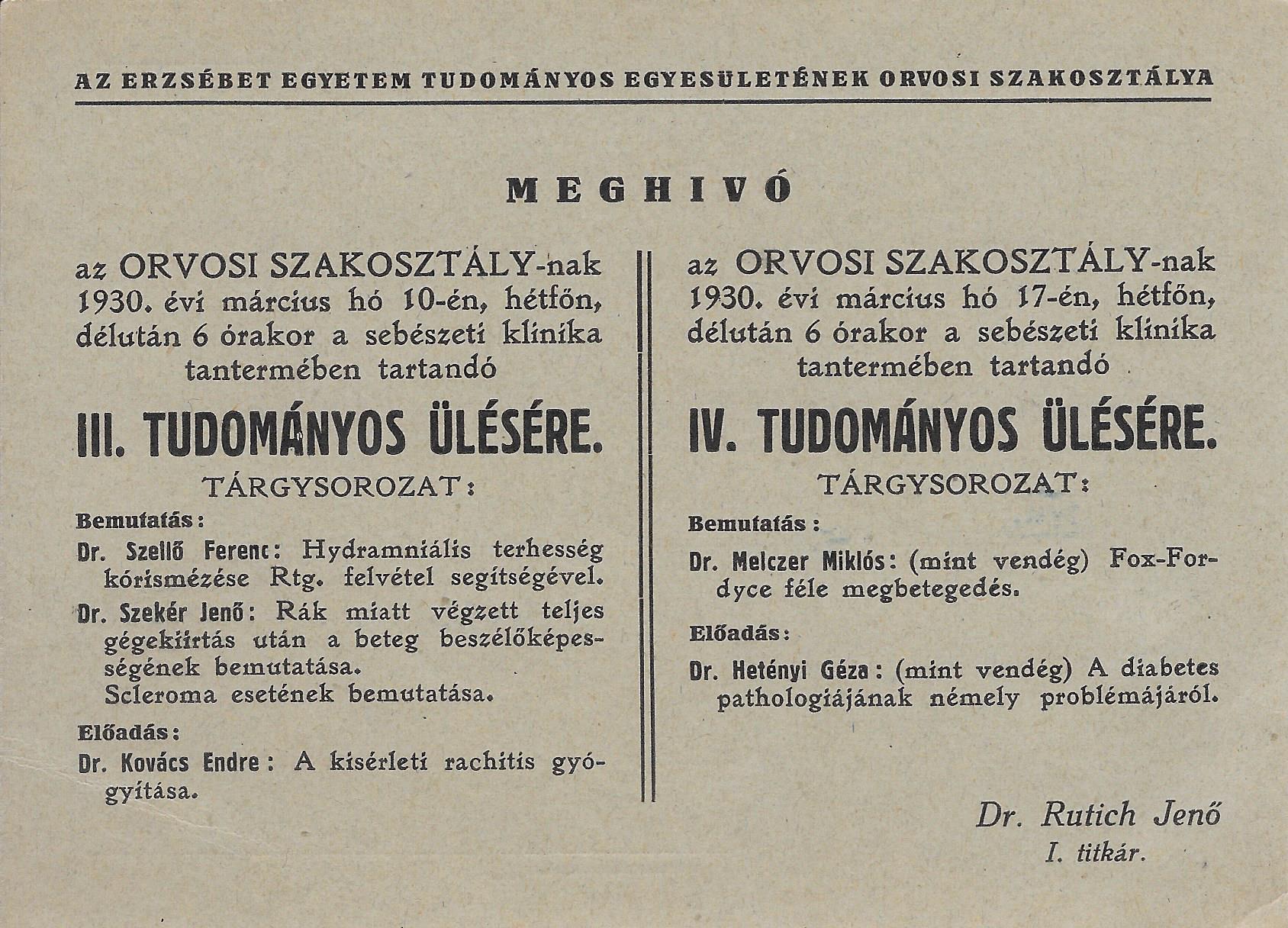3. képMeghívó az ETE Tudományos Egyesület Orvosi Szakosztályának tudományos ülésére (Forrás: Pécsi Egyetemtörténeti Gyűjtemény)